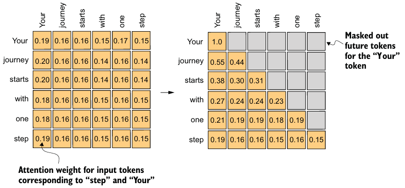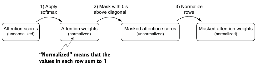 causal attention은 대각선 위의 attention weights가 마스킹되어, 주어진 입력에 대해 LLM이 context vector를 계산하는 동안 future tokens을 활용할 수 없도록 보장한다.