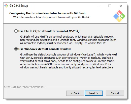 이는 git을 처음 설치할 때, 아래 설정창에서 terminal emulator를 MinTTY(Git Bash의 기본 terminal)로 선택해서 발생한다.