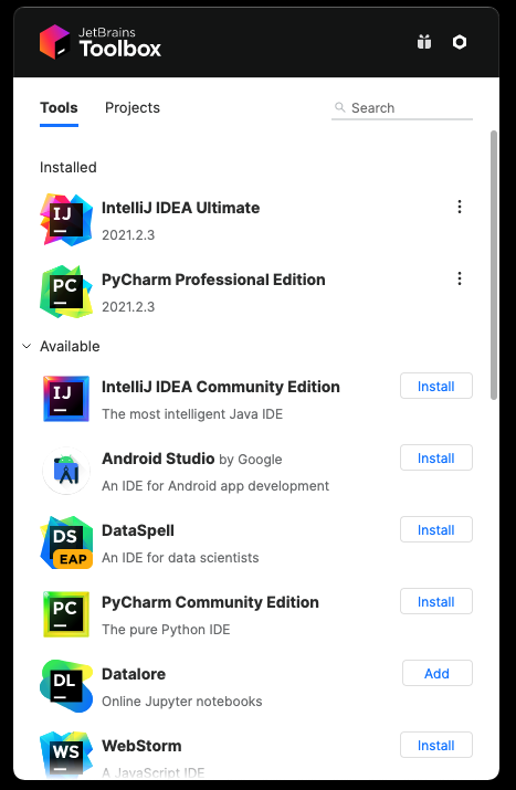 툴박스를 설치하면 위의 화면처럼 JetBrain 회사에서 만든 여러가지 플랫폼을 관리할 수 있으며 간단하게 IDE의 세부정로를 설정할 수 있다.