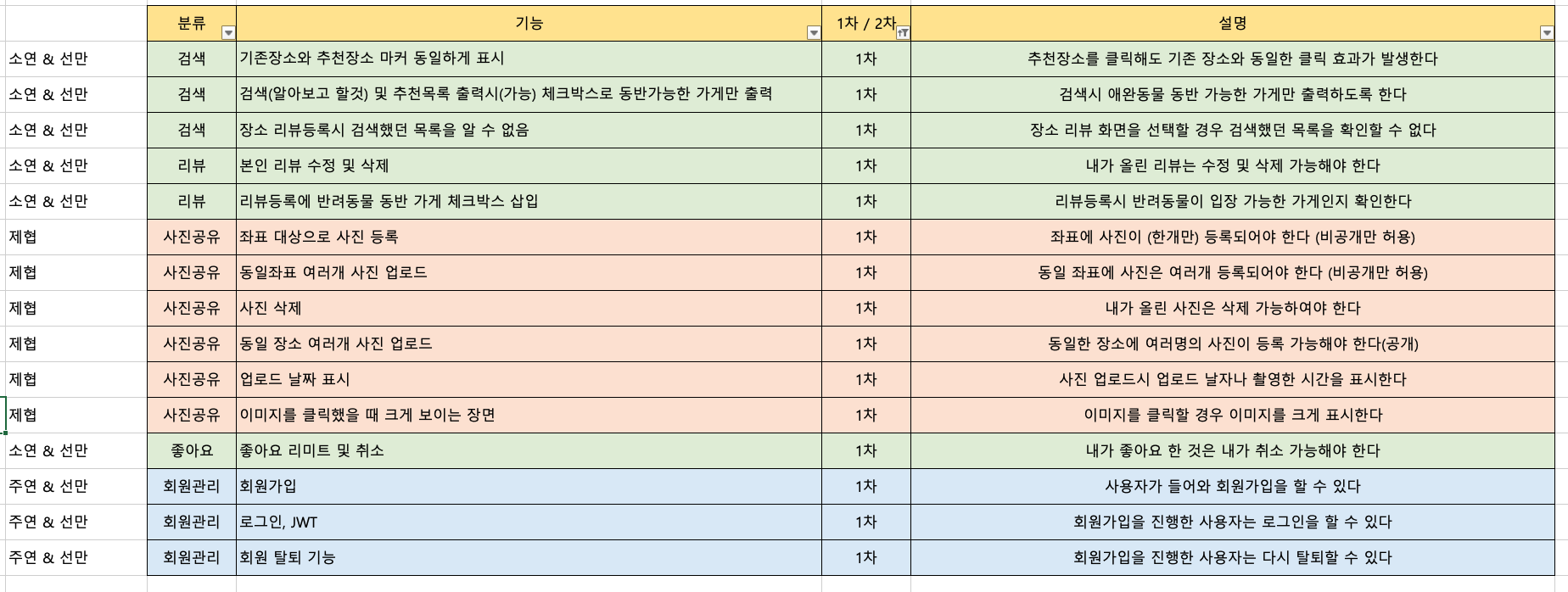 주제가 정해졌으므로 기능을 정의한다. 다른 조는 기능을 어떻게 정하고 결정하는지 잘 모른다. 우리조는 1시간동안 미리 기능을 생각해보고 각 기능을 취합하여 모두와 상의하여 필수기능과 부가기능을 분리하여 작성하였다.