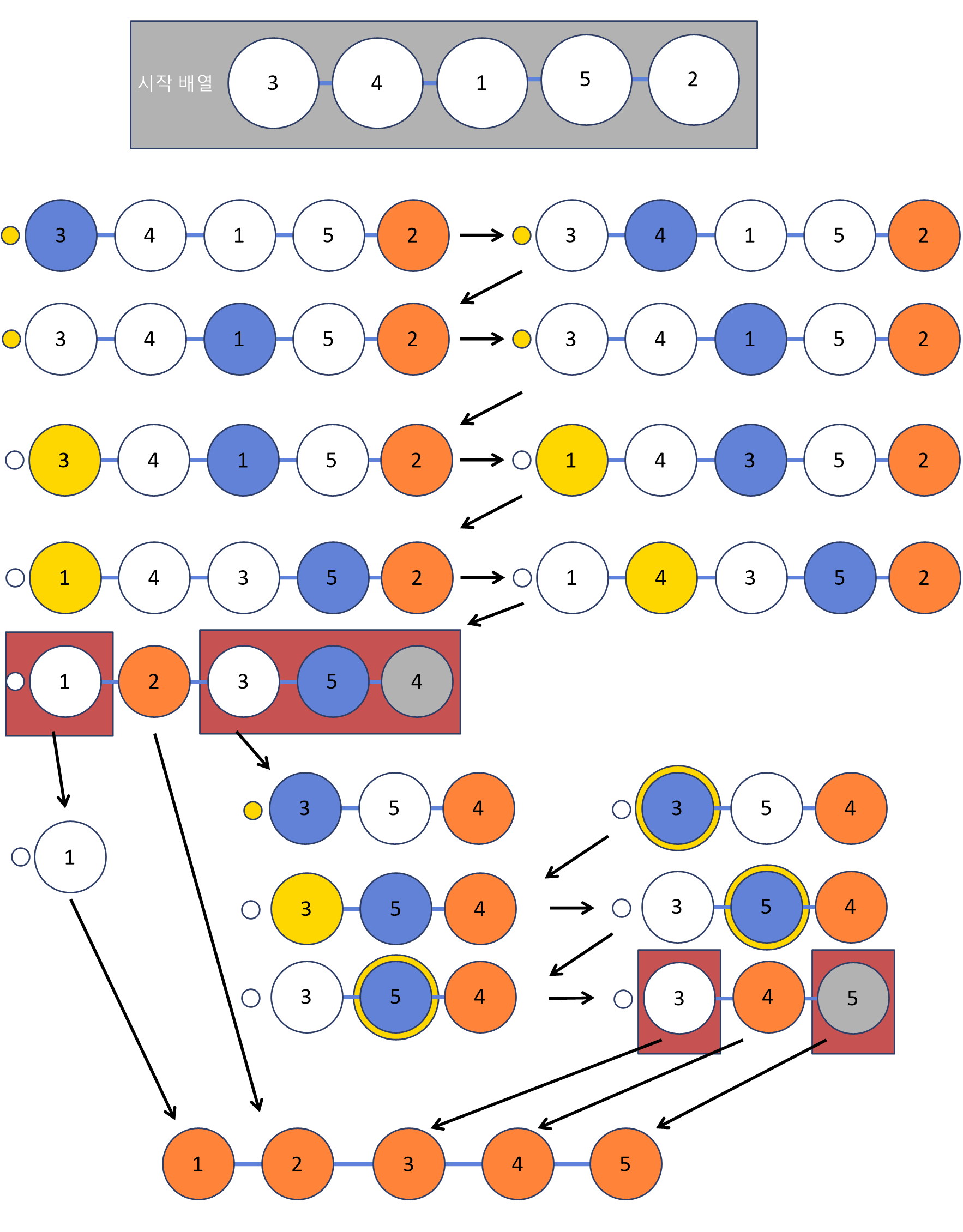 배열 [3, 4, 1, 5, 2]를 퀵 정렬(오름차순, 로무토 파티션)하면 아래와 같다.