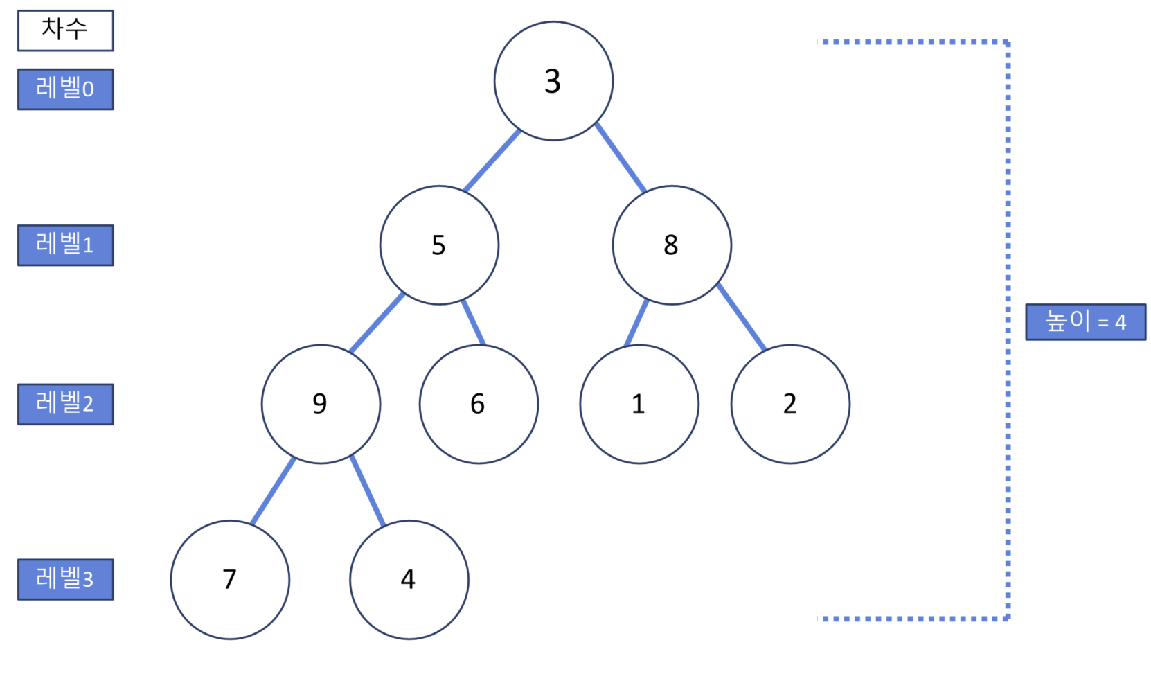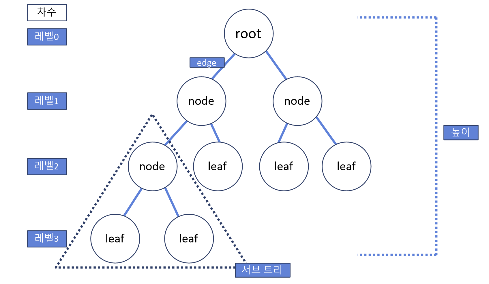 트리는 하나의 뿌리에서 뻗어 나가는 모양의 자료구조이다. 루트(root)로부터 시작해 간선(edge)으로 연결된 자식노드(node)들과 연결된 형태를 갖는다. 자식 노드가 없는 노드를 리프(leaf)라고 하며, 자식노드들은 작은 형태의 트리인 서브트리를 이룬다. 그 외에 루트로부터 멀어진 정도를 나타내는 레벨, 가장 먼 레벨에서 루트까지의 간선 수를 표기하는 높이 등을 활용하여 자료를 분석한다.