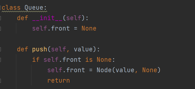 큐 안에 새로운 요소를 넣는 푸쉬 함수입니다. 안에 요소가 없으면 self.front 값으로 요소를 저장합니다. 안에 다른 요소가 있다면, 출구와 가장 가까운 요소(self.front)부터 차례로 순회하여 마지막 요소의 next값으로 가리켜 줍니다.
