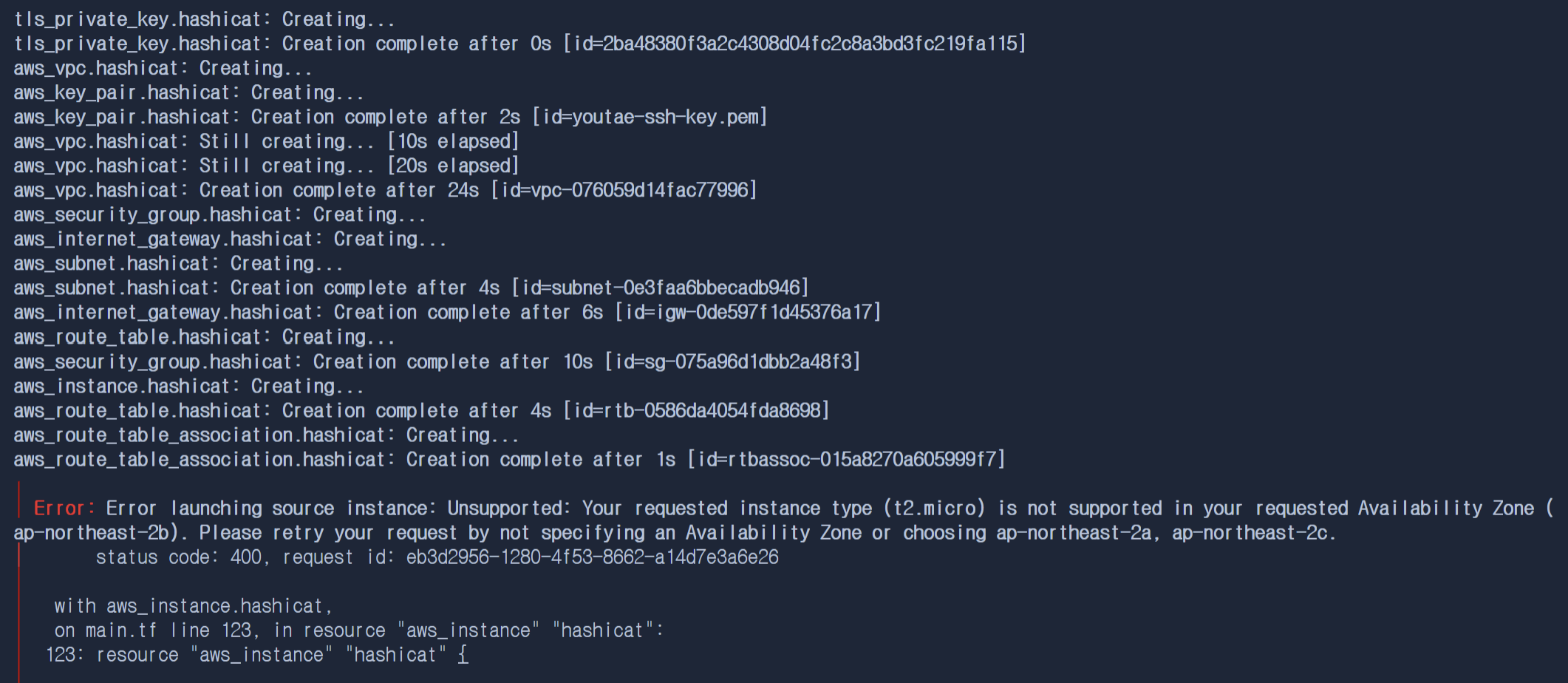 t2.micro가 ap-northeast-2b에는 지원이 되지 않았고 내가 가용영역을 제대로 설정하지 않았기에 자동으로 테라폼이 b를 선택하면서 문제가 생긴 것이다.