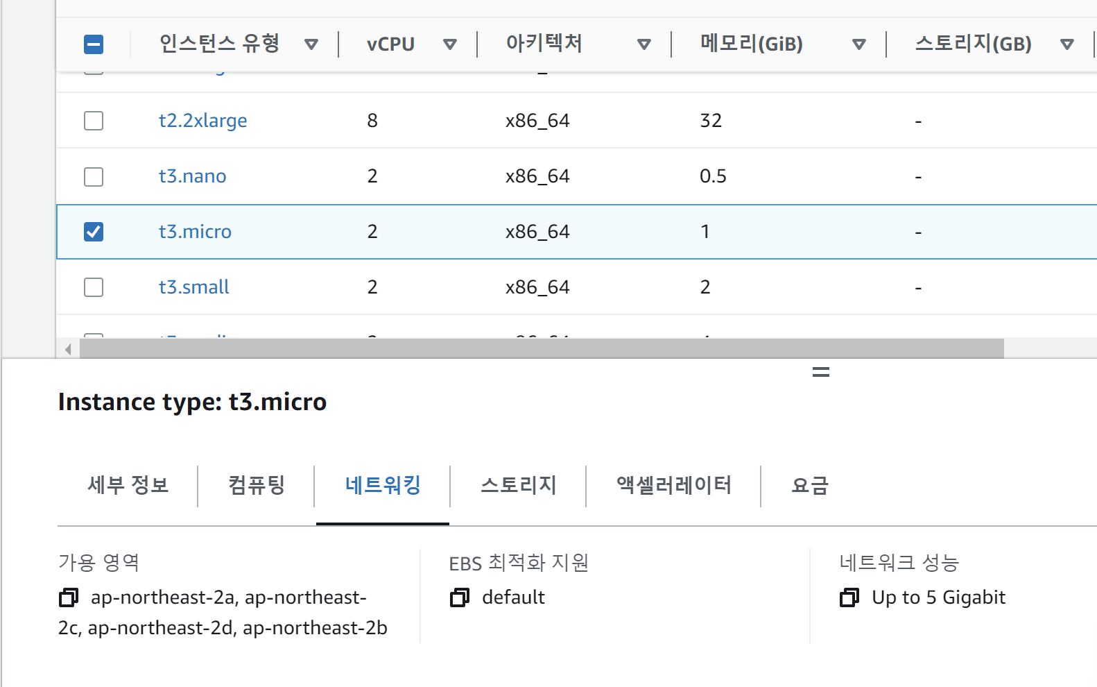 이 사진을 보면 t3.micro의 가용영역이 ap-northeast-2a, ap-northeast-2c, ap-northeast-2d, ap-northeast-2b인 것으로 확인할 수 있다.