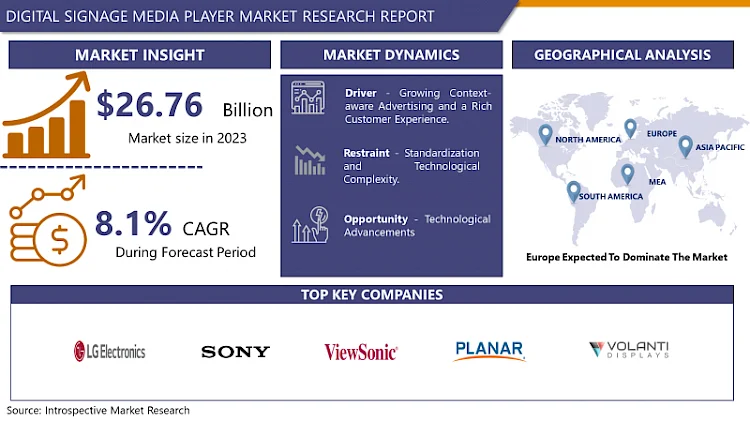Digital Signage Media Player Market Size Was Valued at USD 26.76 Billion in 2023, and is Projected to Reach USD 53.94 Billion by 2032, Growing at a CAGR of 8.1% From 2024-2032.