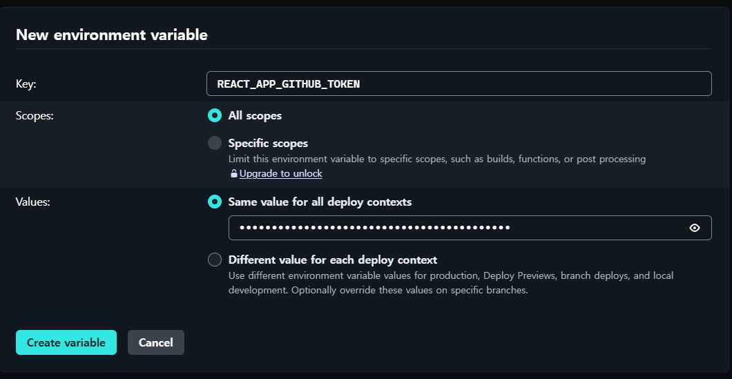 - 모든 환경변수를 입력한 후 "Create variable" 버튼을 클릭하여 저장합니다.