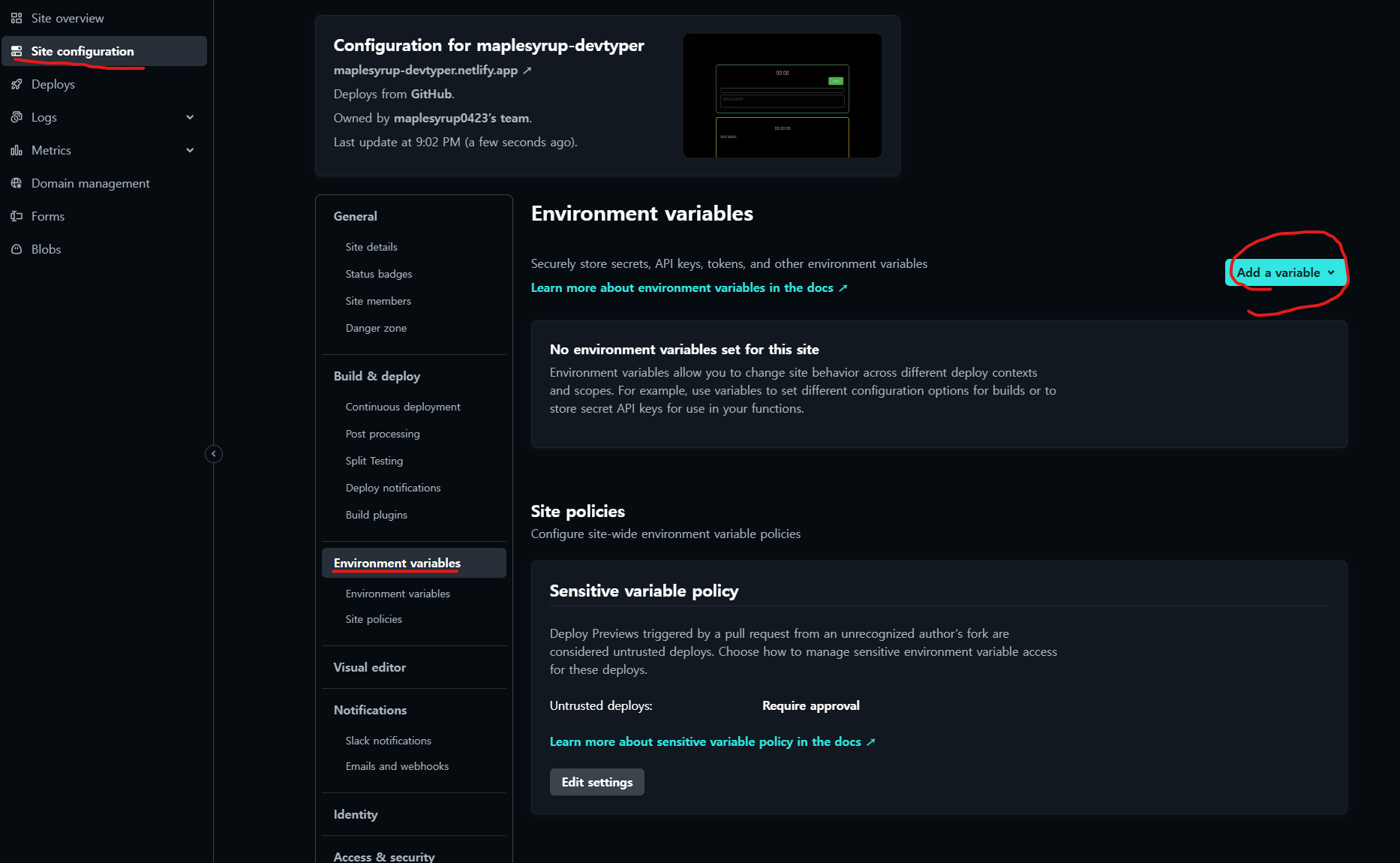 - 왼쪽 메뉴에서 "Environment Variables" 부분에서 "add a Variables" 버튼을 클릭합니다.