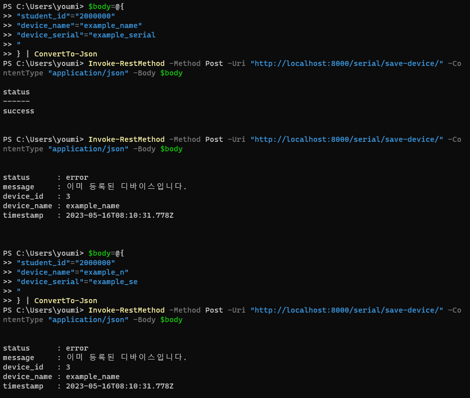 문제의 원인을 알기 위해 서버의 api에 직접 POST 요청을 해본 결과 이미 등록된 디바이스를 저장하지 않고 error status로 정상적으로 출력하는 것을 알 수 있습니다.