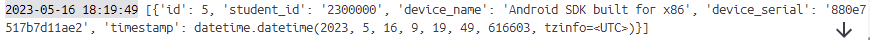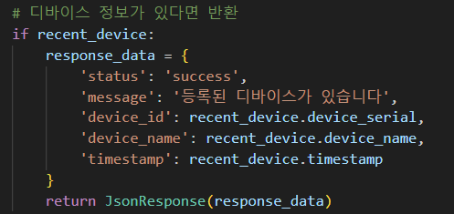 django 서버의 views.py에서 'device_id': recent_device.id를 'device_id': recent_device.device_serial로 변경해주고 다시 기기등록을 실행했습니다.