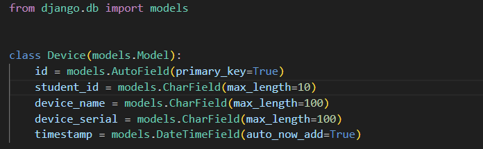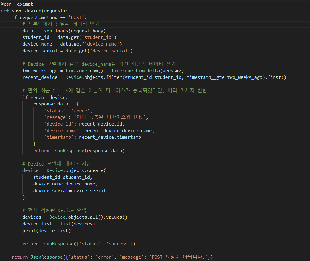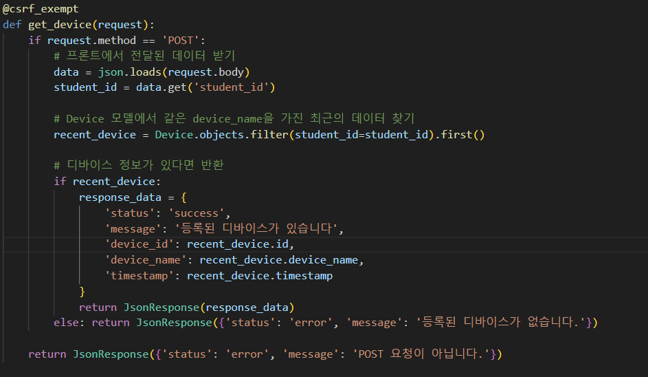 views.py의 get_device 함수의 코드입니다. url은 /serial/get-device/이고 student_id를 post해야 한다는 것을 알 수 있습니다.