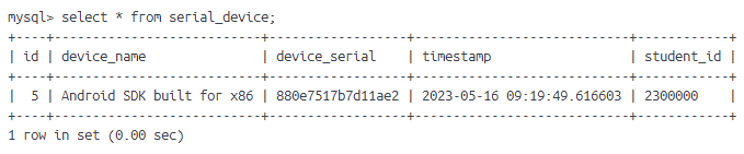 mysql-server의 terminal에서 serial_device table에 select를 해본 결과 db에도 device_name, device_serial이 성공적으로 저장된 것을 확인할 수 있습니다.