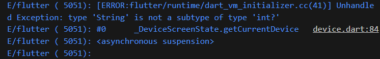이 에러의 의미는 Dart/Flutter 코드에서 'int' 타입이 'String' 타입의 서브타입(subtype)이 아니라는 의미입니다. 하지만 우리가 받아야하는 device_id, device_name, timestamp는 모두 string type입니다.