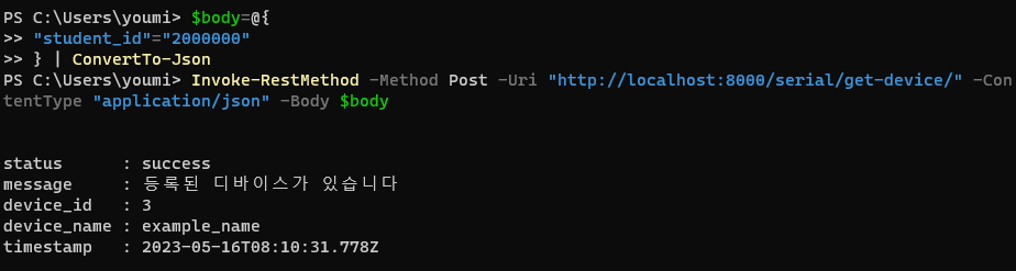 status가 success일 때 이미 해당 student_id인 학생이 이미 등록된 device가 있어 현재 등록된 device의 정보를 response.body에 담아 보내주는 것이기 때문에 String current_id, current_name, current_time에 해당 값들을 담아줍니다.