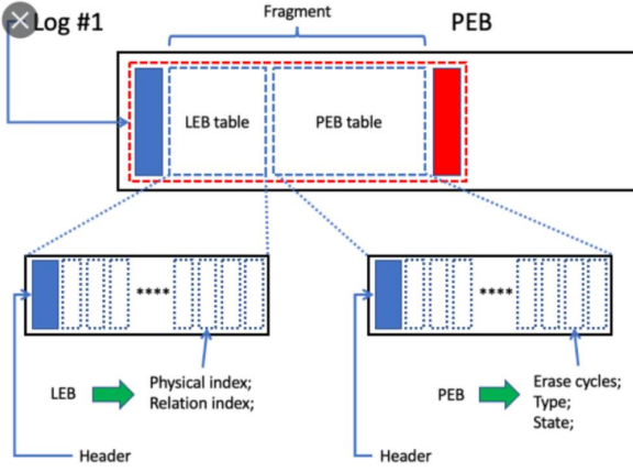 UBI는 EC 헤더와 VID 헤더 두 개를 관리하는데, EC는 erase 횟수를 count하는 영역이고 VID 헤더는 어떤 volume에 어떤 PEB가 속하는지, volume 내에서 LEB의 번호는 무엇인지 등을 저장한다.