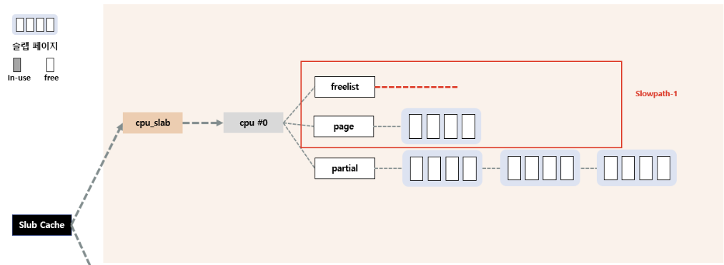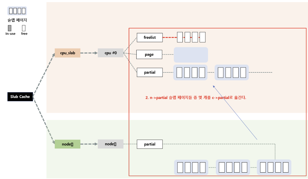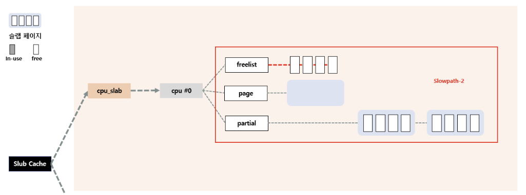 page의 freelist에도 할당할 object가 없는 경우, percpu의 partial 필드를 이용한다. partial에서 대기 중인 slab page를 page로 올리고, page 내부의 object들을 다시 freelist로 올려서 다시 fastpath를 수행한다.