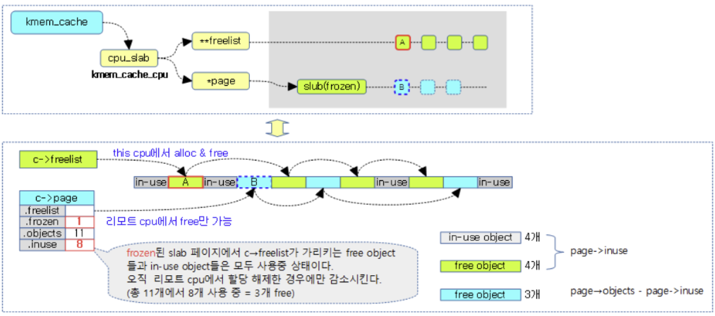 후자는 현재의 CPU가 관리하는 freelist로, object의 할당 및 해제가 자유롭다. 반면 전자는 다른 CPU가 현재 CPU가 관리하는 object를 해제한 경우 object를 반환받는 리스트로, 다른 CPU에서 해당 리스트의 free object에는 해제만 할 수 있고 할당이 불가능하다. page 필드의 inuse 값은 page->freelist에서 사용 중인 object 수를 의미하고, percpu의 freelist에서 사용 중인 object 수와는 관계가 없다.
