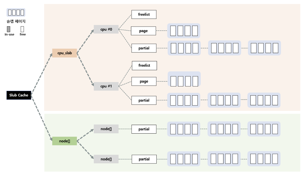 위 코드는 slab cache가 코드로 구현된 구조체 kmem_cache이다. 내부에 있는 두 개의 구조체로 node별로, cpu 별로 메모리를 관리한다.