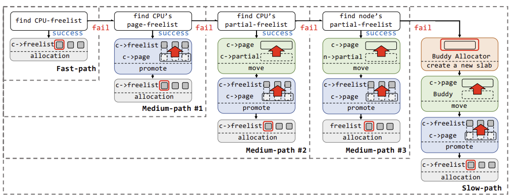 percpu의 freelist에 object가 없는 경우, percpu의 page 필드 내의 freelist에 들어있는 object를 percpu의 freelist로 올리고, fastpath를 시도하는 할당 방법이다. 이 경우 page 내부의 object들이 반환되기 전까지 해당 page는 frozen 상태가 되어, kmem_cache의 관리를 벗어난다.