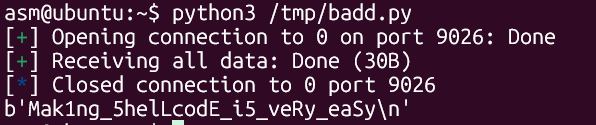 위 파일을 바이너리로 컴파일하고, xxd -i 옵션으로 byte형태로 추출, pwntools에서 bytes 함수를 통해 하나의 bytecode로 합친 후 입력값으로 넣어주면 flag를 출력할 수 있다.