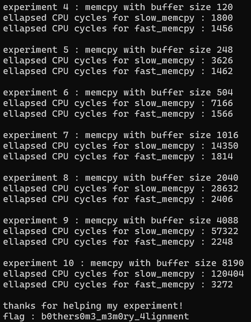 이후 10번의 반복을 하는데, low와 high 사이 범위의 수를 입력 받고 memcpy를 통해 시간을 계산하고 (rtdsc 이게 시간 측정해주는 asm인듯) 계속 출력한다.