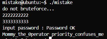fd=open("/home/mistake/password",O_RDONLY,0400) < 0 에서 오른쪽 연산이 먼저 수행되어, fd(3이상) < 0 의 논리 연산이 먼저 이루어지고 거짓이기 때문에 fd에 0이 들어간다.
