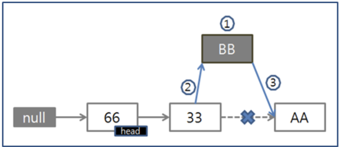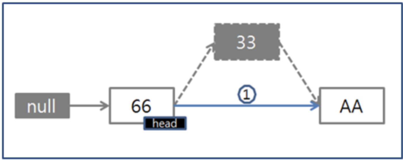 - 삭제할 node[33]의 이전 node[66]의 다음 node를 삭제할 node[33]의 다음 node[AA]로 설정