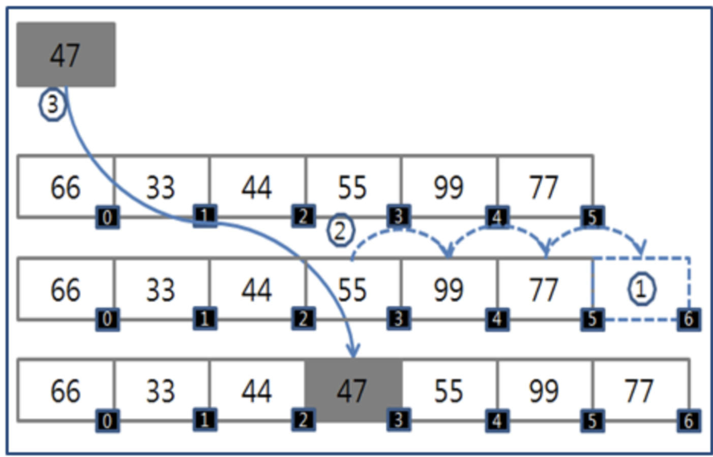 - 삽입될 자료의 위치를 기준으로 기존의 자료들으르 한 칸 씩 뒤로 혹은 앞으로 이동하는 연산을 수행한다.