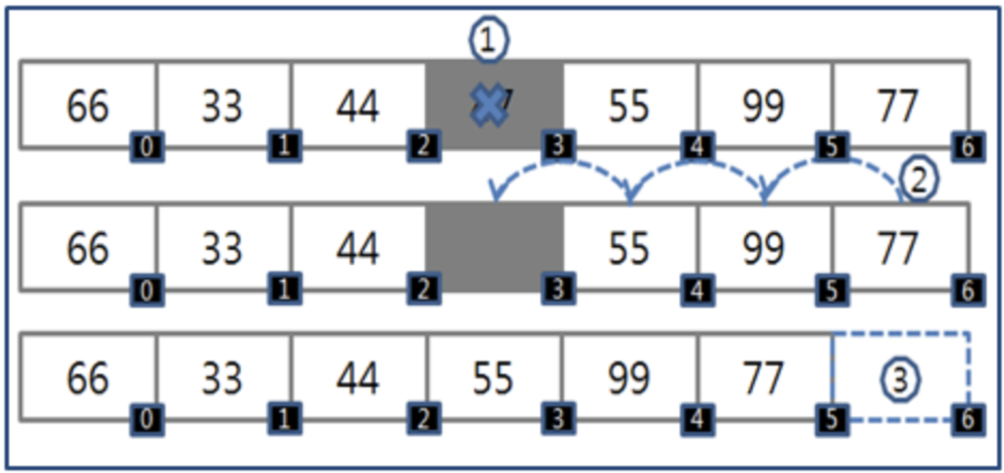- 삭제한 자료의 인덱스를 기준으로 이후의 자료들을 이동하는 연산을 수행한다.