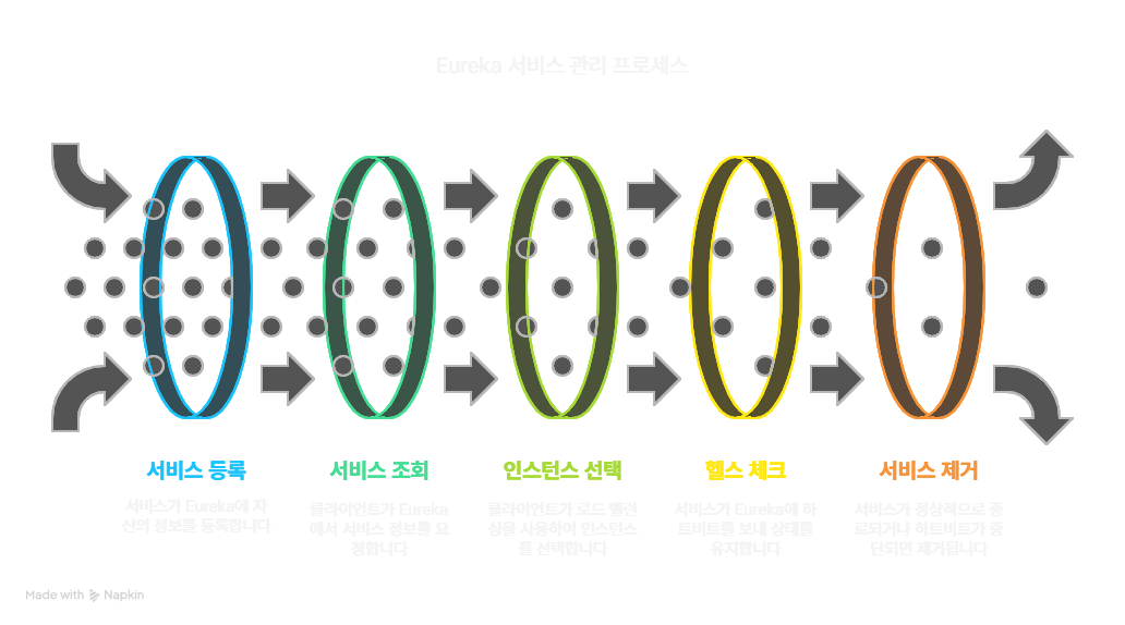 Eureka는 넷플릭스가 개발한 서비스 디스커버리 서버로, 마이크로서비스 아키텍처에서 서비스의 위치 정보를 동적으로 관리합니다. Eureka는 중간 계층 로드 밸런서(middle-tier load balancer)로 정의되며, 각 서비스의 IP, 포트, 인스턴스 ID 정보를 REST 기반으로 관리합니다.