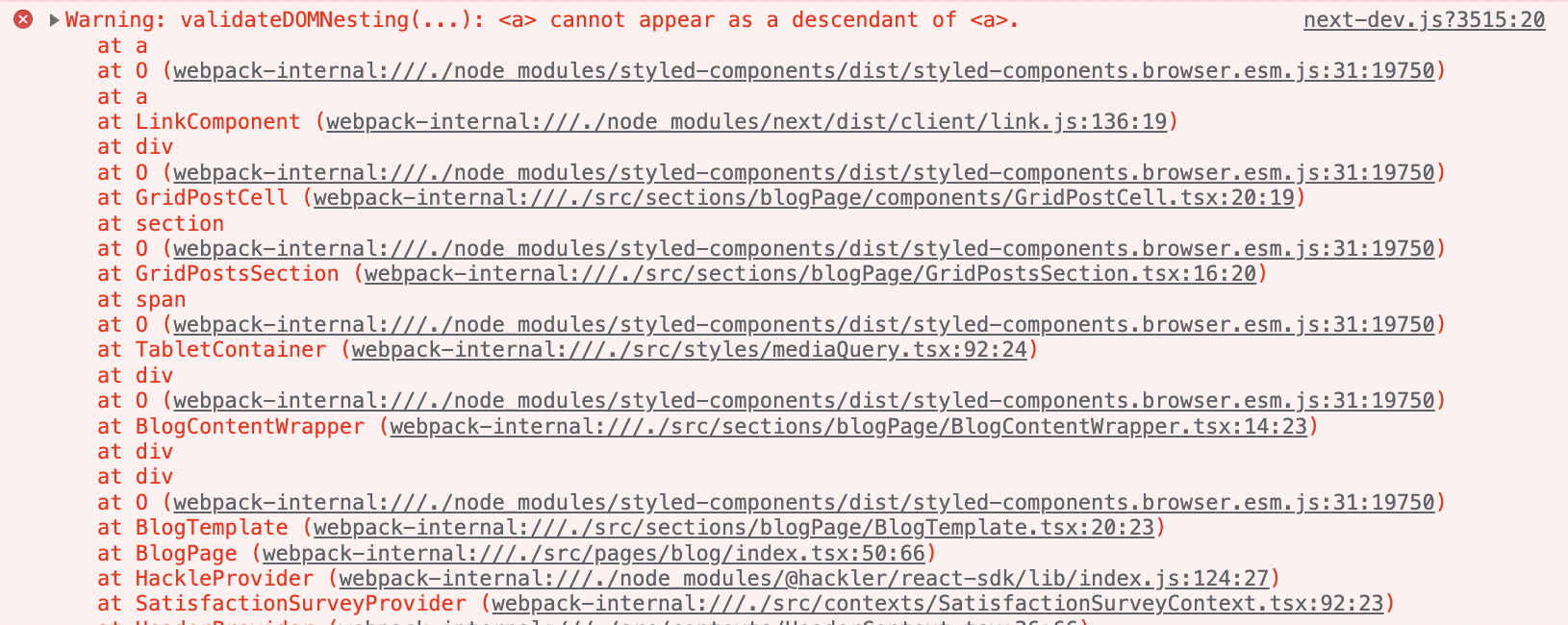 이 때문에 기존에 내가 작성했던 Next/link를 활용한 코드는 <a>안에 <a>를 갖는 구조가 되었고, 유효하지 않은 HTML 구조가 되어버렸다.