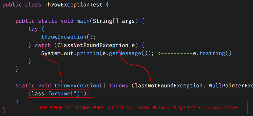 “j” 라는 이름을 가진 메서드는 만들지 않았기에 ClassNotFoundException이 일어난다 -> throws로 넘겨줌