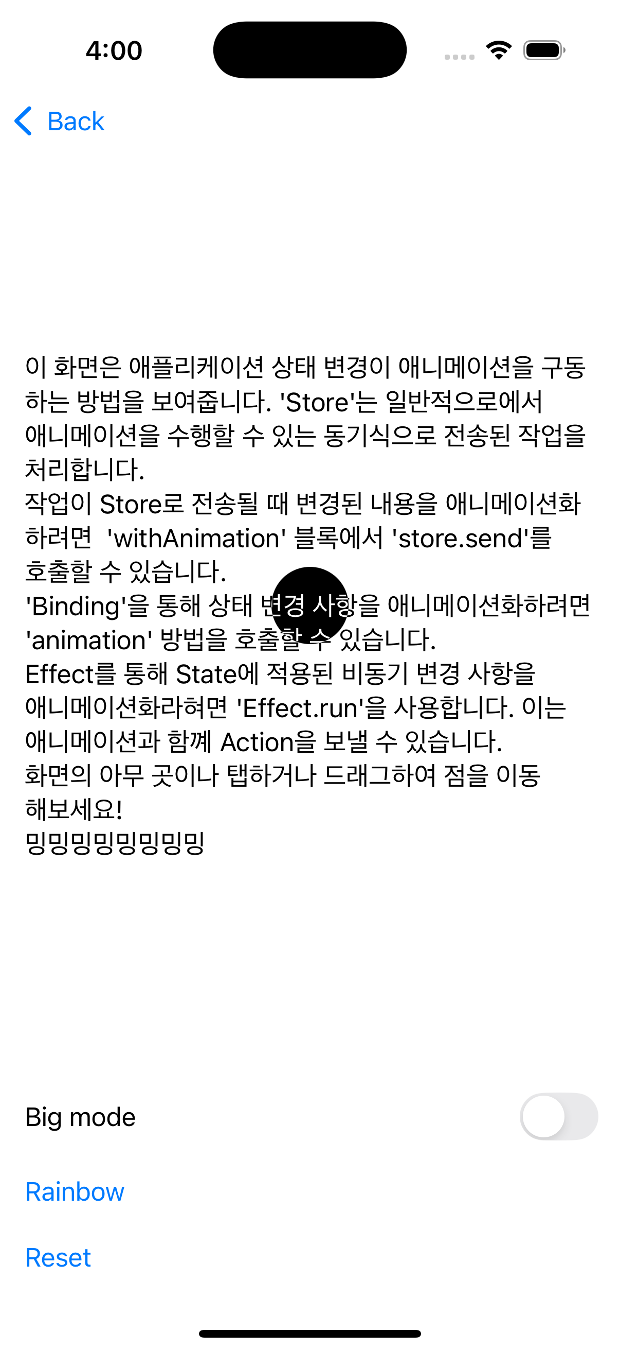 이번 글에서는 TCA를 활용해 애니메이션과 제스처를 관리하는 방법을 살펴봤습니다.
