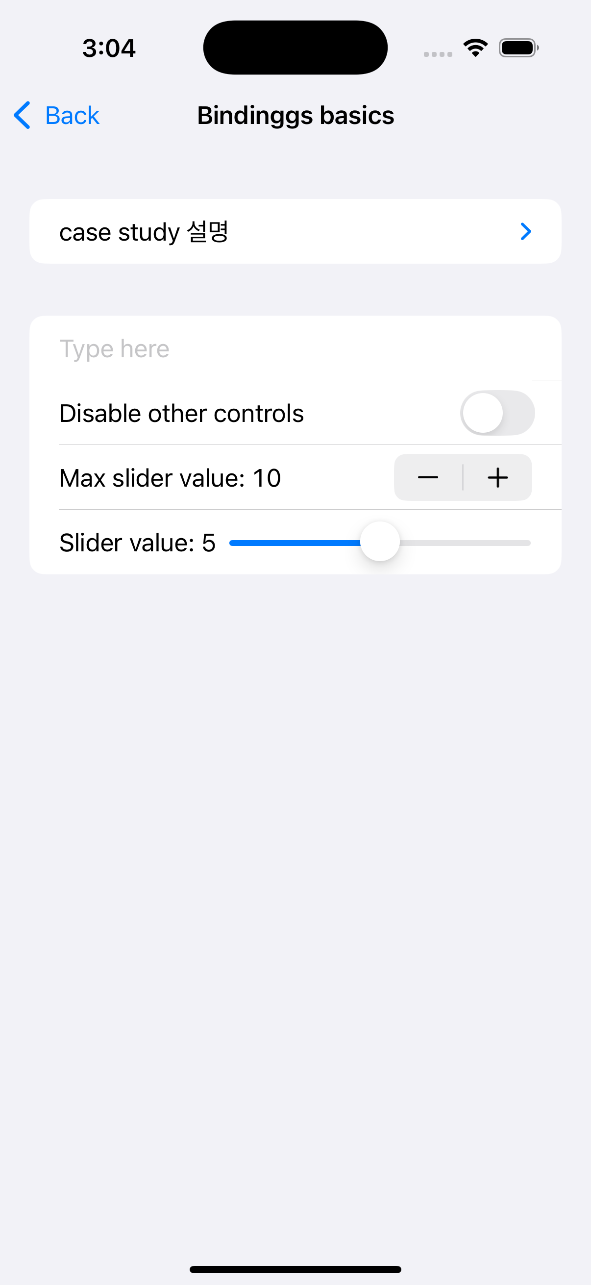 다른 컨트롤을 활성화/비활성화하는 로직을 toggleIsOn 상태로 관리합니다.- Stepper와 Slider: