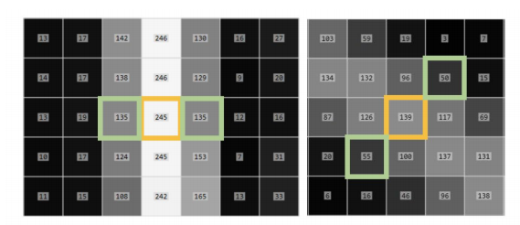 -> 그래디언트 크기가 낮은 임계값과 높은 임계값 사이라면 픽셀을 약한 엣지로 간주