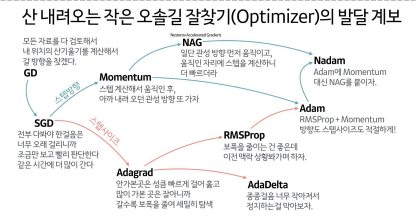 -> 옵티마이저 선정: 옵티마이저는 loss를 어떻게 줄일 것인지 결정하는 방법을 선택하는 것