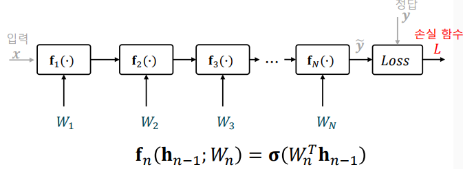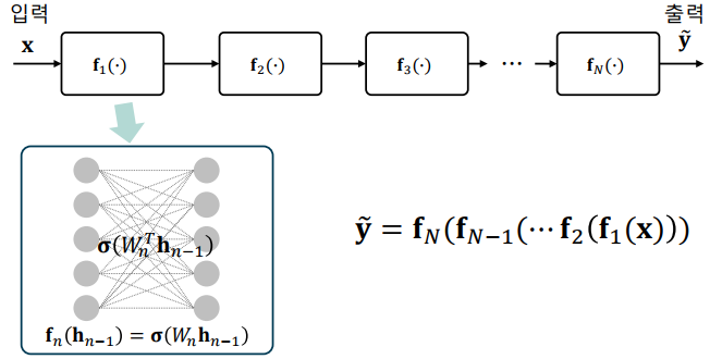 심층신경망의 함성 함수 표현: 심층신경망의 각 계층을 함수로 치환하면, 입출력 관계를 하나의 합성 함수로 바꾸어 표현할 수 있음