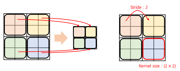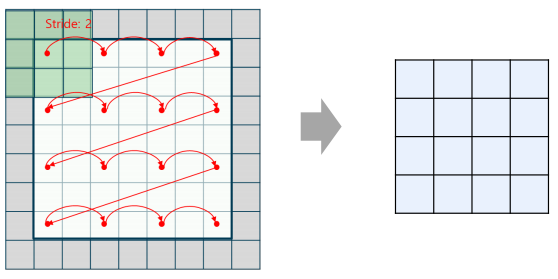 스트라이드(Stride): 합성곱 연산에서 커널(필터)가 이동하는 단위로, 1보다 크면 출력의 크기를 감소시킴 (출력의 크기를 반으로 줄이고 싶을 때 사용)