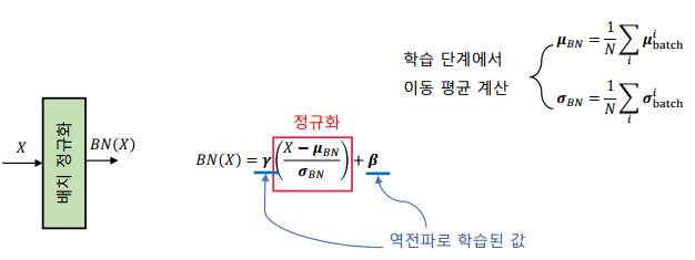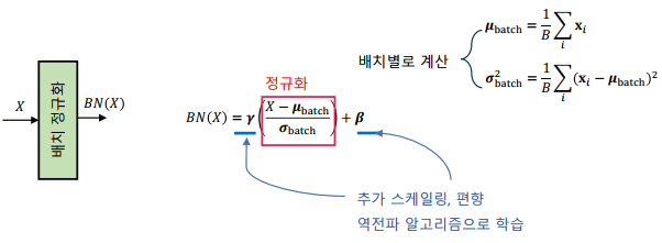 배치 정규화(batch normalization) 계층: 미니 배치 학습 과정에서 배치별로 특징을 정규화하는 계층