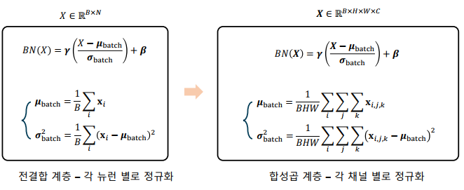 합성곱 계층의 배치 정규화: 합성곱 계층에 적용할 경우, 채널 별로 배치 정규화 수행