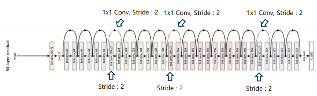 -> 풀링 계층을 대체하는 구조(점선 표기된 skip connection) 도입