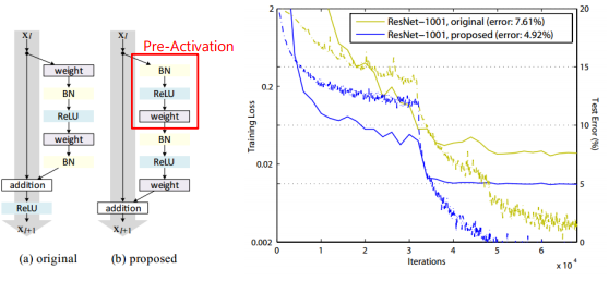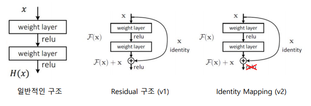 -> 거듭된 연구로 전후 특징을 더한 후 활성 함수를 거치지 않는 identity mapping 구조 확립