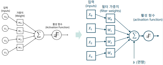 -> 가중치 대신 필터(filter)를, 각 입력을 영상(이차원 신호)로 변환