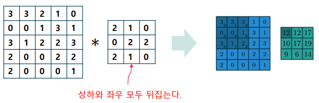 이차원 디지털 신호(영상 신호)는 상하와 좌우를 모두 뒤집어 합성곱 계산을 수행