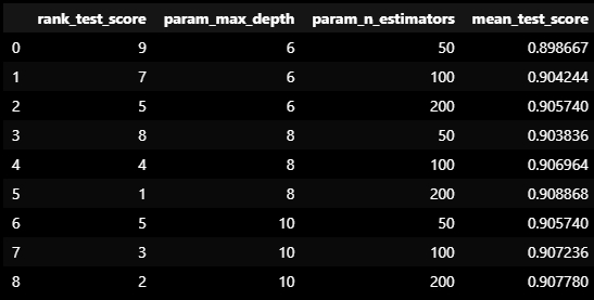 cv_results_df[['rank_test_score', 'param_max_depth', 'param_n_estimators', 'mean_test_score']]