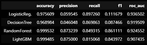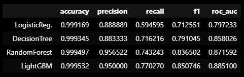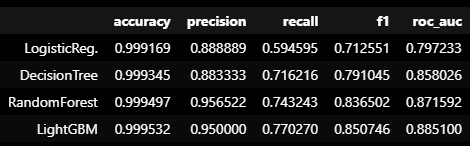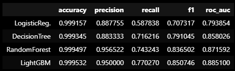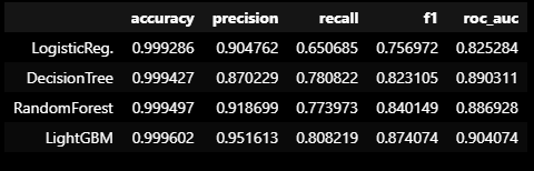 model_names = ['LogisticReg.', 'DecisionTree', 'RandomForest', 'LightGBM']