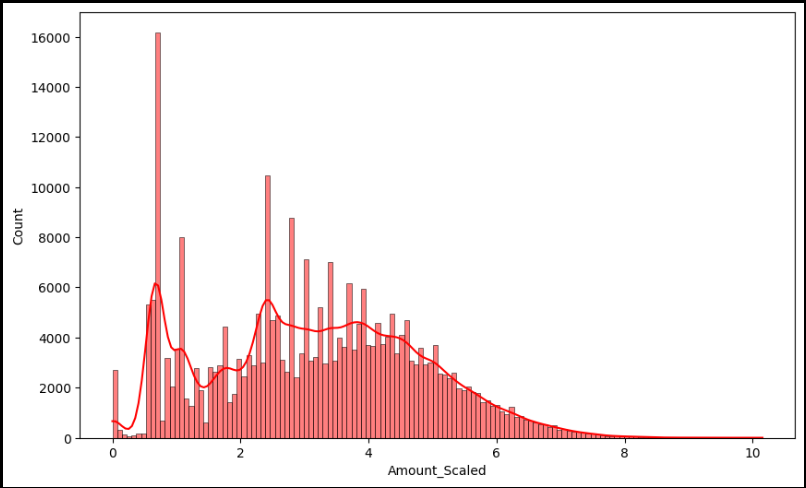 sns.histplot(raw_data_copy['Amount_Scaled'], color='r', kde=True)