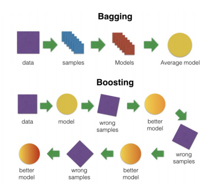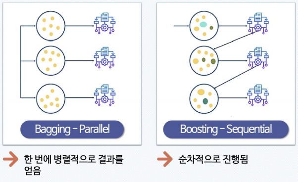 -> 여러 개의 약한 분류기(성능을 낮지만 빠른 것)가 순차적으로 학습을 하며, 앞에서 학습한 분류기가 예측이 틀린 데이터에 대해 다음 분류기가 가중치를 인가해서 학습을 이어 진행