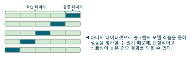 - 중복을 허용하지 않는 k개의 부분 데이터셋(폴드)으로 나누어 검증