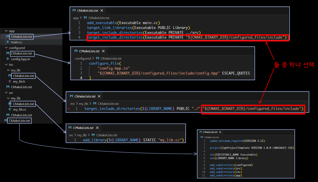 app/CMakeLists.txt 에서 target_include_directories(Executable PRIVATE "${CMAKE_BINARY_DIR}/configured_files/include")inc/my_lib/CMakeLists.txt에서 target_include_directories(${LIBRARY_NAME} PUBLIC "./" "${CMAKE_BINARY_DIR}/configured_files/include")기존 "./" 옆에 따로 추가할수 있다.Executable)이 자동으로 include 경로 받음
